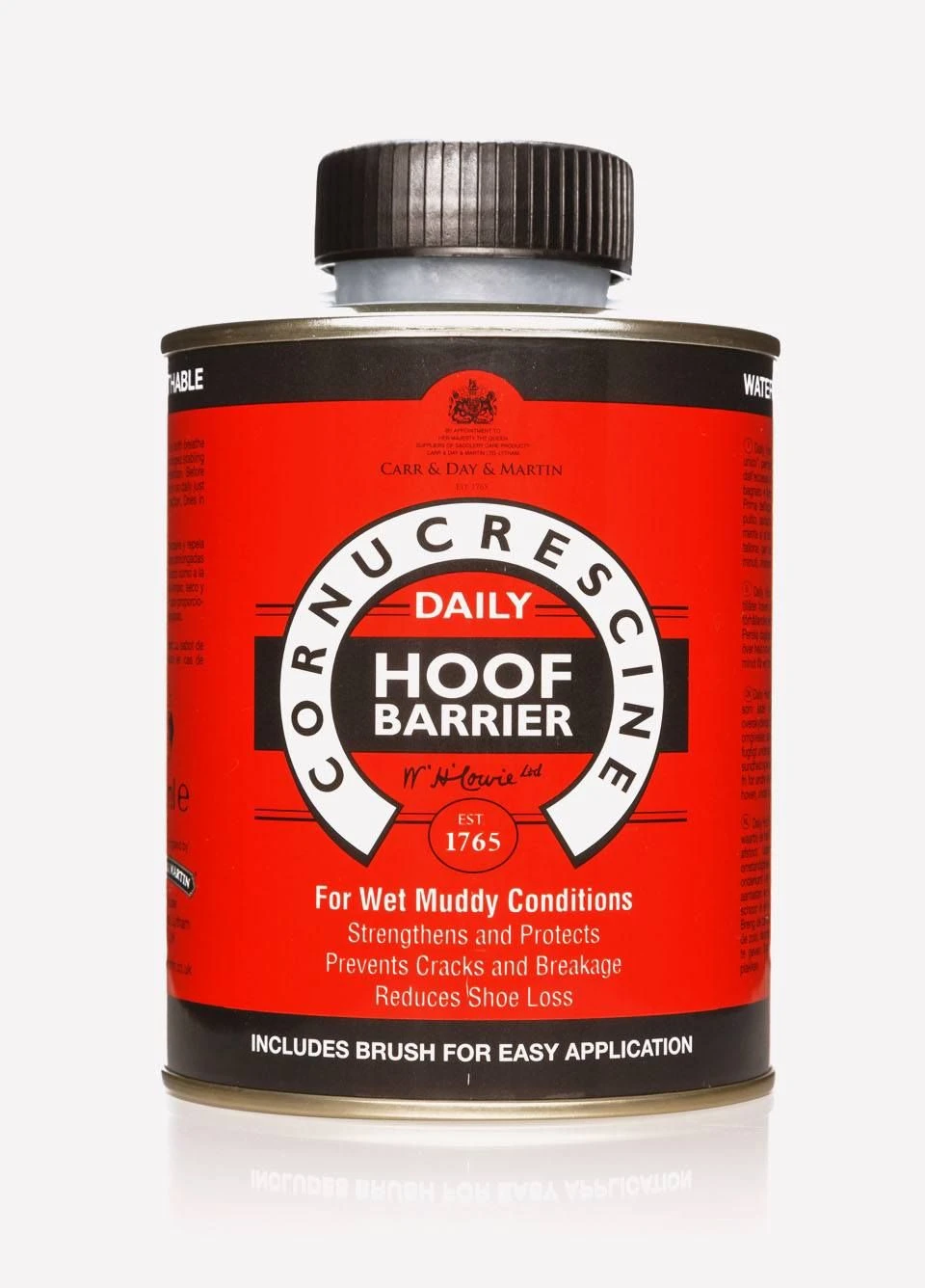 Its advanced formulation creates โone way barrierโ to protect from excessive absorption of water and urine. Furthermore,ย Carr & Day & Martin Cornucrescine Daily Hoof Barrier waterproofs the hoof, yet allows it to breathe naturally and moisture to be repelled. It Contains anti-bacterial agents to guard against bacterial infection.