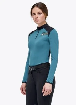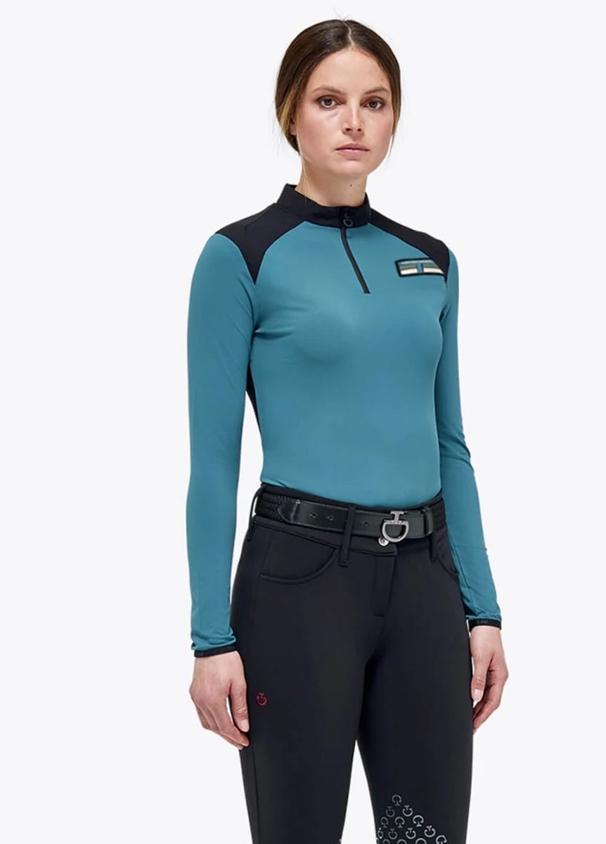 This technical garment guarantees comfort and necessary protection during horseback training. This women’s shirt is made of breathable and flexible piqué with a two-tone inlay that enhances the silhouette and accentuates the movement of the shoulders. It slips on effortlessly thanks to the zip closure embellished with our iconic CT zip puller and features long sleeves with elasticated cuffs for great fit.