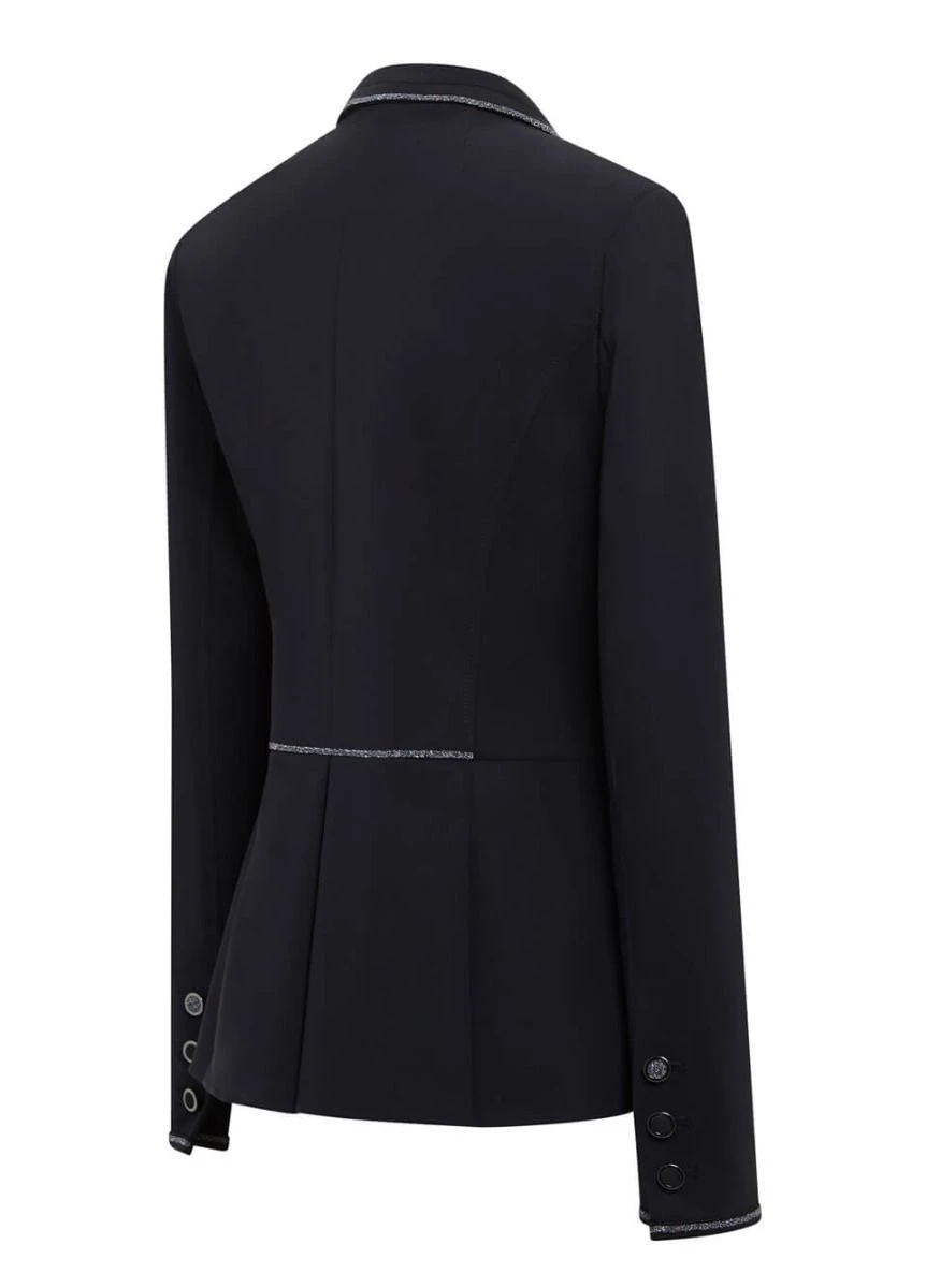Victorine Crystal Fabric embodies style and sophistication with the beautiful Swarovskiยฎ Crystal Fabric and Satin detailing on the collar, cuffs and martingale. This stunning Jacket is cut shorter at the front and with a longer fanned finish on the reverse making this Jacket flattering for all body shapes. This paired with the high stretch, breathable italian fabric for unparalleled comfort and performance make this jacket the perfect partner for any competition rider.