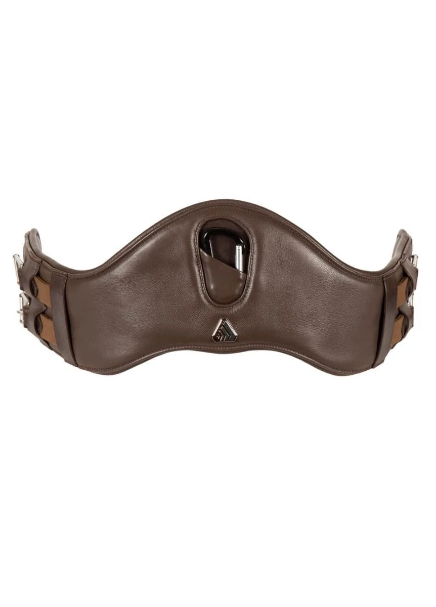 Designed with sensitivity and precision engineered, Velociti Lusso Pro Series Luxe girths are the perfect partner for the next level equestrian. The Dressage Girth features a symmetry promoting contoured and cut away form for an ergonomic, natural fit. A sleek, carefully engineered design incorporates spaces for fittings to keep a refined feel. Butter soft calf leather lining is forgiving against the body. Pressure dispersing padding gives the horse greater freedom of movement with improved range for advanced performance. Smooth, continuous girth edges are padded and curve away from the horse to prevent a โcut inโ edge. A strong and hardwearing outer leather flexes but resists stretching for longevity. Evenly spaced D-rings and central carabiner for easy attachment of training aids or breastplates. High quality stainless steel fittings and twin girth buckles with roller. Double layer pressure alleviating elastic at either end. Girth strap keepers ensure a tidy look. Eco-friendly vegetable tanned European leather.